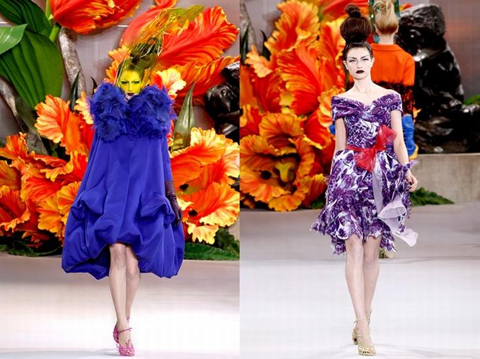 w dzisiejszym wydaniu Dior'a...rządzi przepych i ekstrawagancja...możemy to szczególnie zaobserwować w balowych sukniach w intensywnych odcieniach fioletu, żółci i czerwieni. Słynna klasyka Dior'a w tym pokazie odeszła na bok...jej miejsce zajęły bajkowe dodatki - celafonowe kapelusze i wielkie kokardy, jako paski. Całości dopełniały fryzury oraz intensywne makijaże - lipstick w kolorze czerni i rainbow'owe cienie do powiek.
